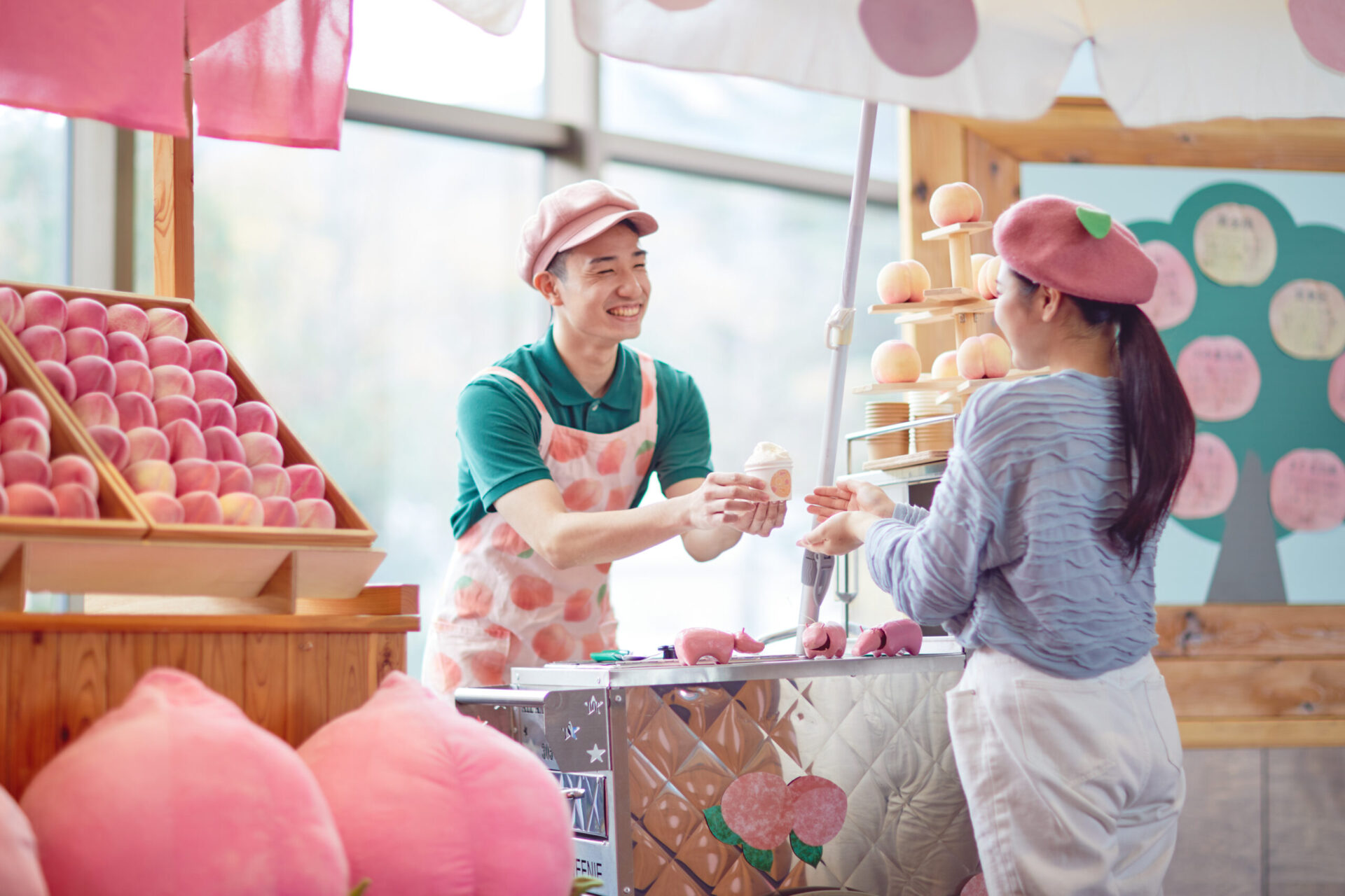 桃ドリンクスタンドでは様々な桃を使ったひんやりドリンクを提供します。中でもおすすめなのは、新鮮なまま品種ごとに瞬間冷凍した桃とヨーグルトやはちみつを掛け合わせたオリジナルの「ももモクテル(*3)」で す。その他にも、完熟した果実で絞った100%桃ジュースや、桃とお酒を合わせたカクテルなど、アルコールを飲めない方も、飲める方も一緒に桃を楽しめるメニューが勢ぞろいします。
