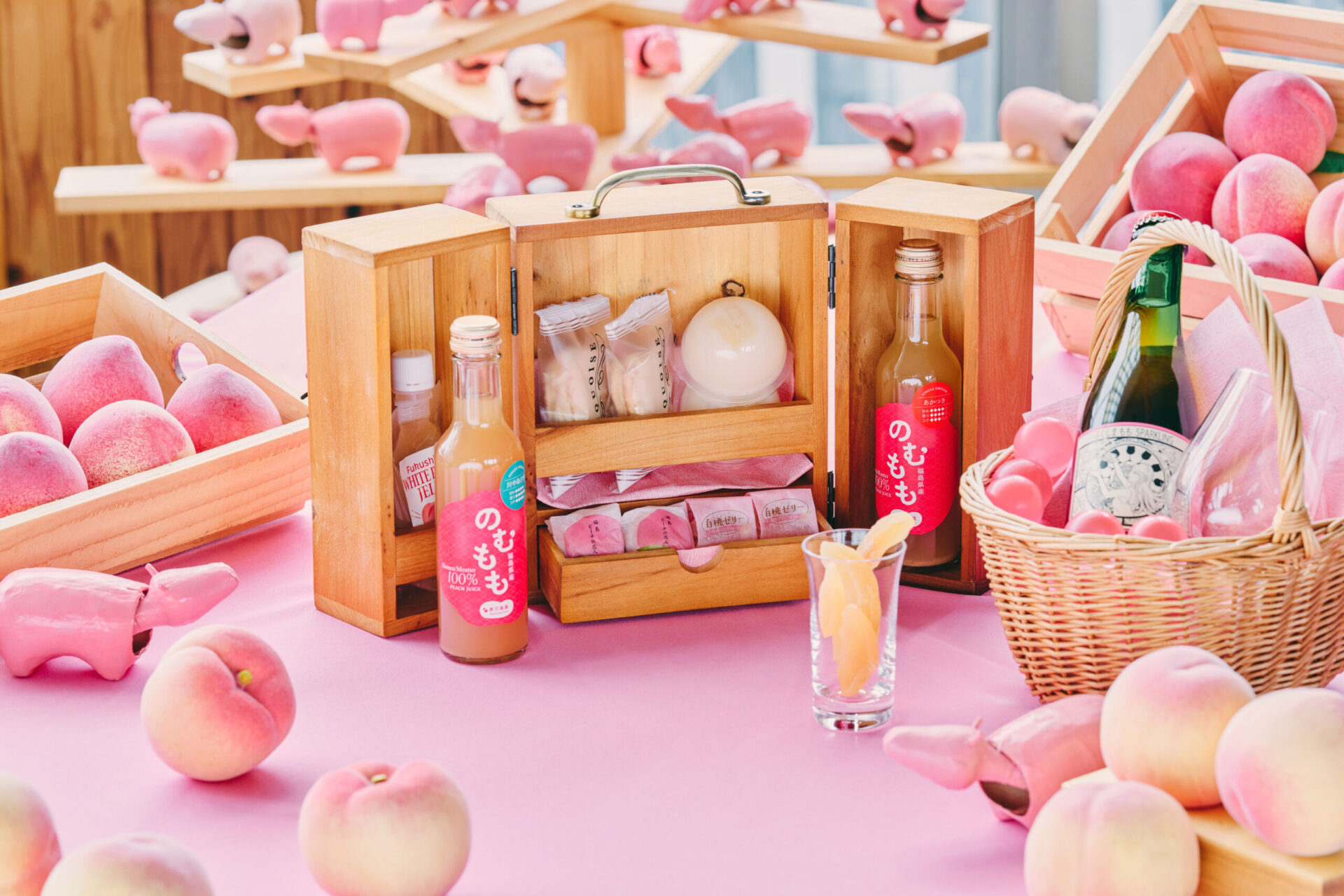 今年は、桃好きの人に向けた、お部屋でも楽しめる桃アイテムとして、「桃ナイトセット」が新登場します。ボックスの中には、桃のスパークリングワインや品種で飲み比べできる桃ジュース、桃のドライフルーツや焼き菓子などが入っていて、夜眠る前まで思い存分桃を楽しめます。