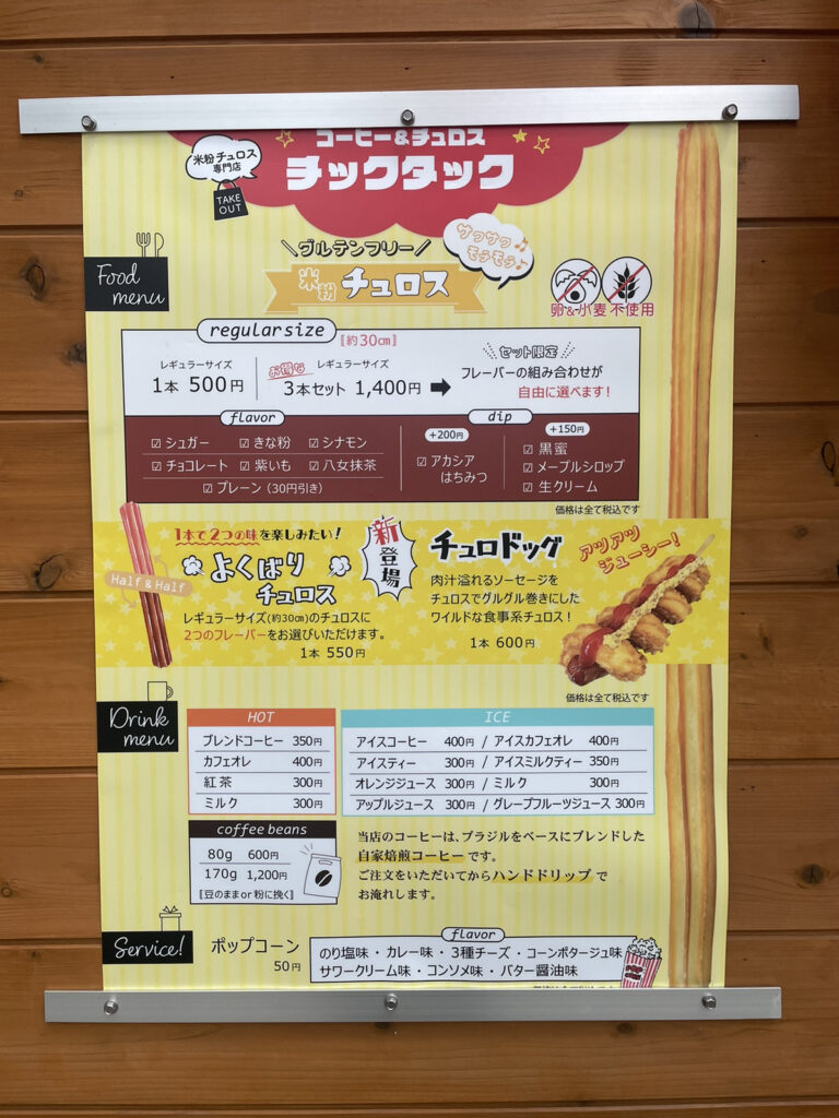 揚げ菓子「チュロス」は、スペイン発祥のスイーツで、スペイン語圏の中南米諸国でも広く食べられています。チュロスは小麦粉で作られた生地を棒状に絞り出し、油で揚げたものですが、チックタックでは生地に国産米粉と揚げ油は国産米油を使用したグルテンフリーです! チラシをいただきました。