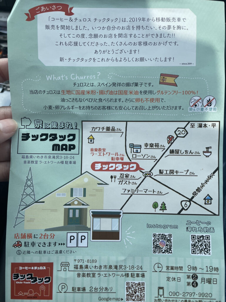 いわき市泉ににコーヒー&チュロス、チックタックが8月4日にオープンしました。2019年に移動販売を行い、いつか!自分でお店を持ちたいと夢を抱きながら、今回オープンになったそうです。 夢を諦めない!ってとても素敵ですよね。