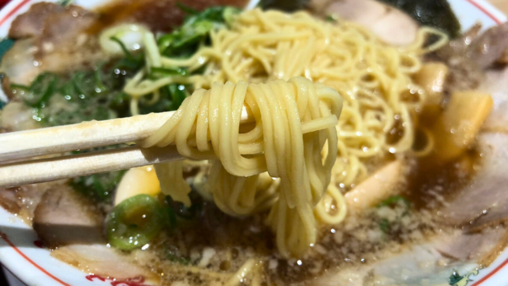 コシのある中細ストレート麺、熟成醤油ダレでじっくり煮込んだ薄切りの特製チャーシューが特徴。
