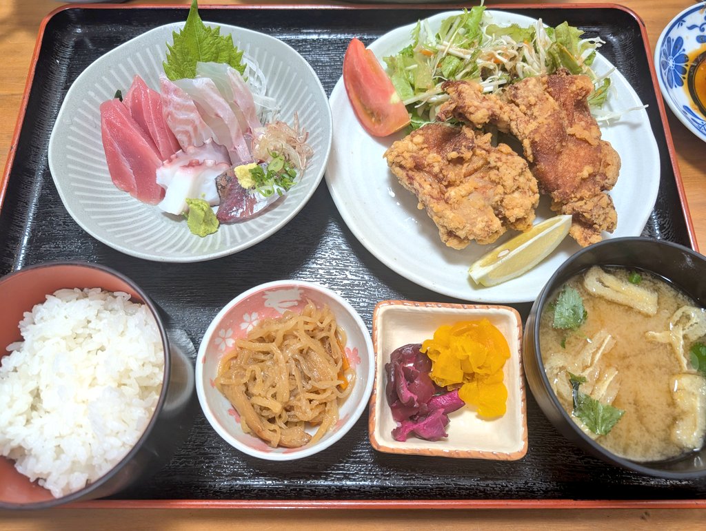運ばれてきた瞬間から、食欲をそそる香りが漂います。揚げたての唐揚げと、つやつやと輝く刺身。まさに「最強の組み合わせ」と言っても過言ではないでしょう。ジューシーなデカイ唐揚げから。衣はサクサクと小気味よい音がするほど軽やかで、噛みしめると同時に、肉汁がじゅわっとあふれ出てきます。下味がしっかりついていて、何もつけなくてもご飯が進むほどのパンチの効いた味わいです。