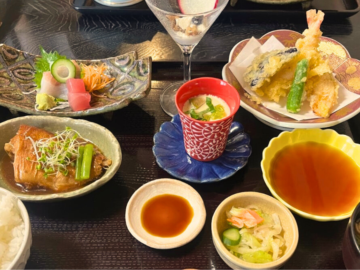ひと口サイズなので、あれもこれも欲張りに楽しめます。茶碗蒸し、箸休め、香の物、汁物も付いて、見た目も美しい大満足のランチです。