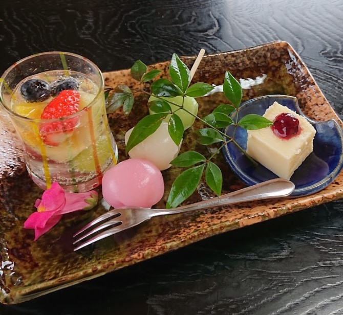 御食事をした方は、コーヒー付きの甘味三種盛セットが550円で楽しめます。食後のデザートまで福がいっぱいの、大満足のランチタイムをお過ごしください。