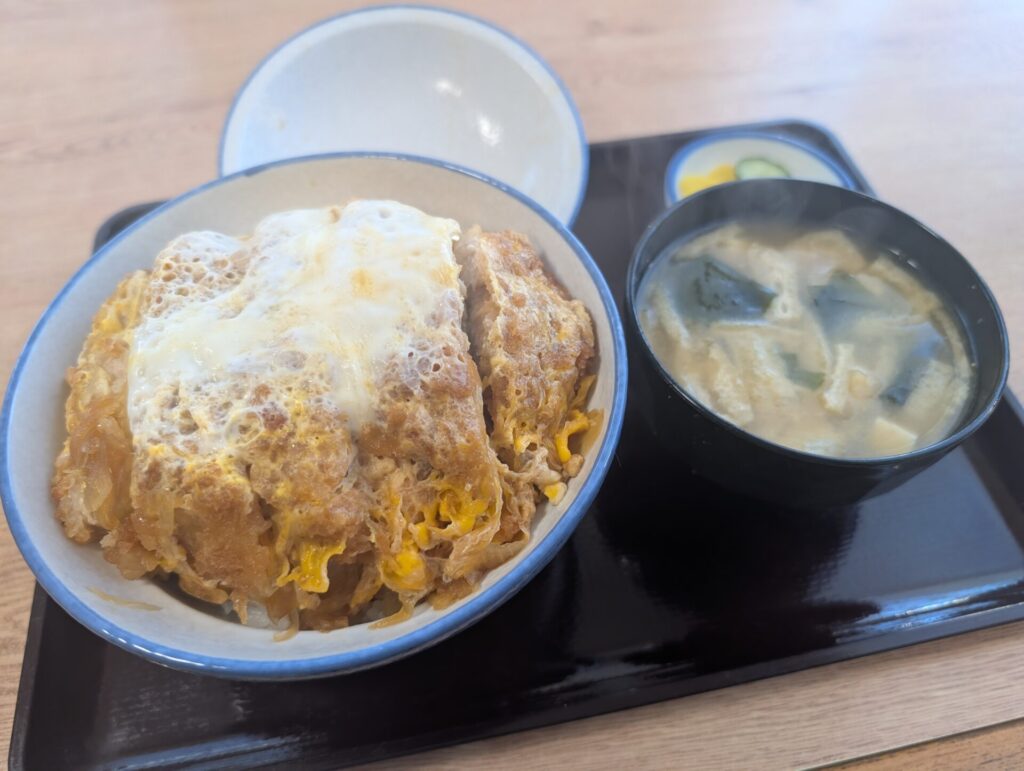 いよいよ運ばれてきた「カツ丼」の姿に、思わず「おぉ…!」と声が漏れました。まず目を引くのが、その圧倒的なボリューム!丼から溢れんばかりに盛り付けられたとんかつと、それを覆い尽くす黄金色の卵。これはもはや、食べる芸術です。お味噌汁とお新香が脇を固め、最強の布陣が完成しています。