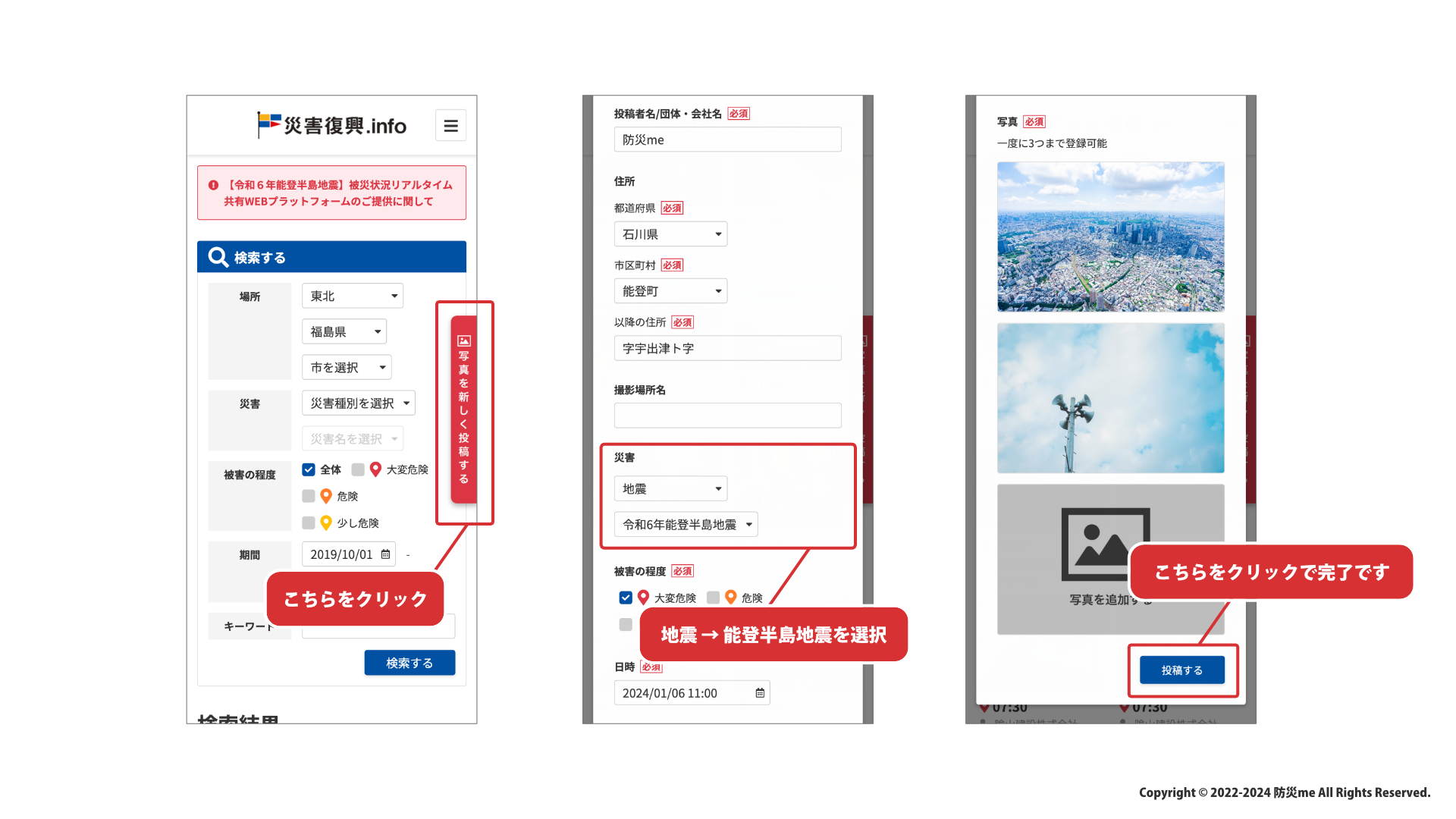 令和6年能登半島地震の被災地支援において、防災meは「災害復興.info」の提供を無償で開始しました。このWEBプラットフォームでは、写真投稿機能を無制限に利用でき、被災地の状況をリアルタイムで共有できます。また、募金情報もサイト上で無償で掲載され、支援活動の迅速化に寄与します。詳細はこちら。